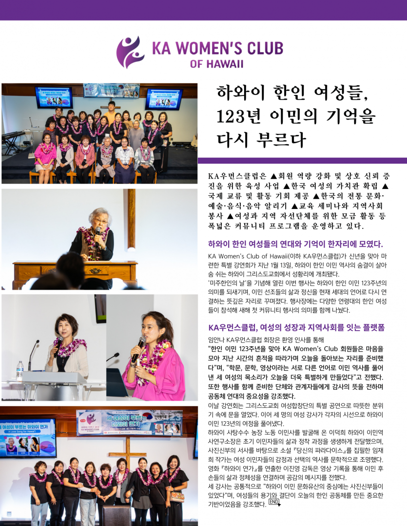 하와이 한인 여성들의 연대와 기억이 한자리에 모였다. KA Women’s Club of Hawaii(이하 KA우먼스클럽)가 신년을 맞아 마련한 특별 강연회가 지난 1월 13일, 하와이 한인 이민 역사의 숨결이 살아 숨 쉬는 하와이 그리스도교회에서 성황리에 개최됐다.