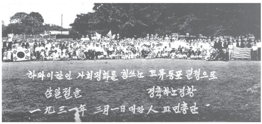 1937년 3월 1일, 하와이 한인 사회가 삼일절을 기념하며 한자리에 모였다. 태극기와 성조기가 함께 걸린 이 장면은 이민자들의 정체성과 독립 의지를 동시에 보여준다. (Photo Courtesy 재외동포사총서 )잔디 위에 수백 명의 사람들이 서 있다. 아이부터 노인까지, 정장을 차려입은 남성들, 한복을 입은 여성들, 그리고 맨 앞에 조심스럽게 펼쳐진 태극기. 이 사진은 단순한 단체 기념사진이 아니다. 망명지에서 지켜낸 조국의 기억이자, 고향에서 멀리 떨어진 땅에서 이어진 독립운동의 기록이다.
